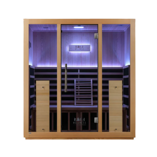 Elevate your wellness experience with the Kiva Radiance 4 Person Full Spectrum Infrared Sauna. Equipped with near, mid, and far infrared heaters, it delivers fast-acting warmth for both quick sessions and deep, immersive therapy. Designed for comfort, the sauna features a contoured ergonomic backrest, a reversible bench seat, and ambient chromotherapy lighting to create a soothing, full-sensory environment. Crafted from durable Canadian Hemlock and high-quality toughened glass, this low-EMF, non-allergenic sauna is safe, stylish, and built to last—perfect for both home and commercial use.
